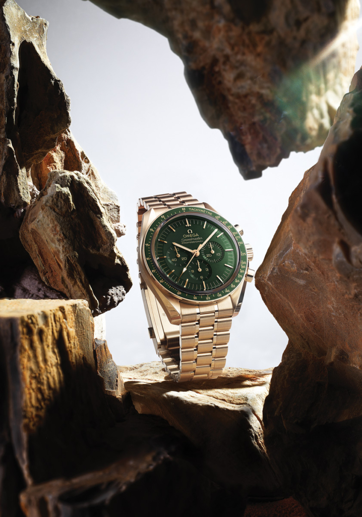 주변의 그린 세라믹 베젤 링에는 오메가 세라골드TM 타키미터 스케일을 장착해 독창성을 더한다.