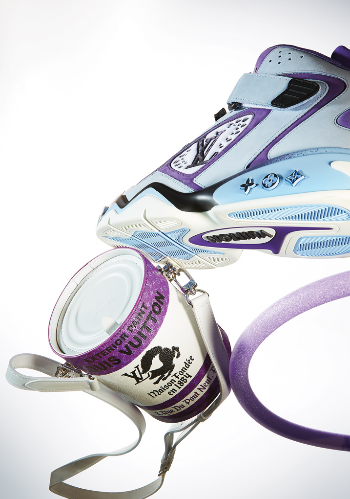 - Louis Vuitton 빈티지 농구화에서 영감을 받은 LV 트레이너 2 스니커즈와 LV 페인트 캔 백.