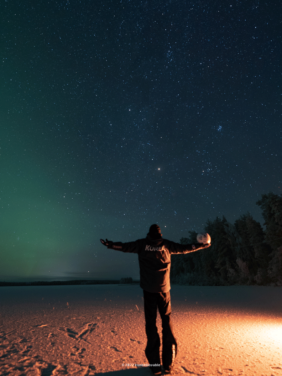 오로라 헌팅을 다니며 눈밭에 앉아 명상이나 요가 수련을 한다. 눈을 감은 채 호흡을 이어가다 눈을 떴을 때 마주한 광경은 형언할 수 없을 만큼 아름답다. 별이 쏟아지고, 푸른빛 오로라가 춤을 춘다.