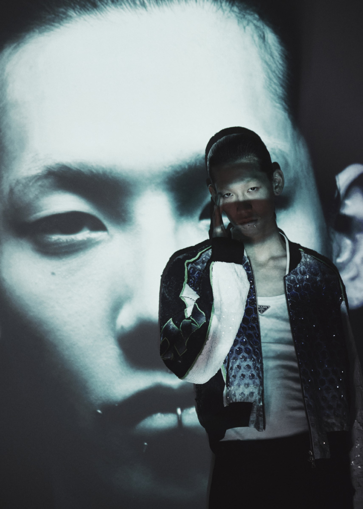 스팽글 블루종과 스트라이프 쇼츠 모두 Dries Van Noten, 화이트 로고 슬리브리스 톱 Prada.