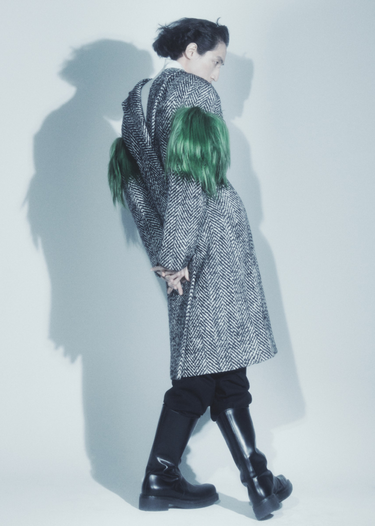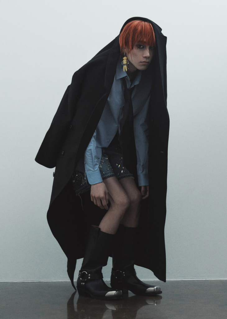 블랙 오버사이즈 코트와 스카이블루 셔츠, 비즈 장식 데님 쇼츠, 하네스 디테일 부츠 모두 Gucci,