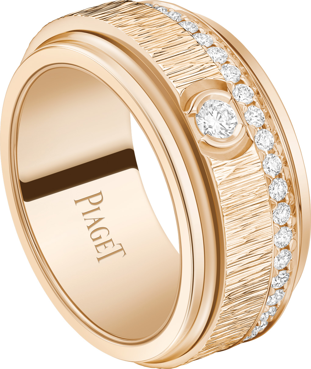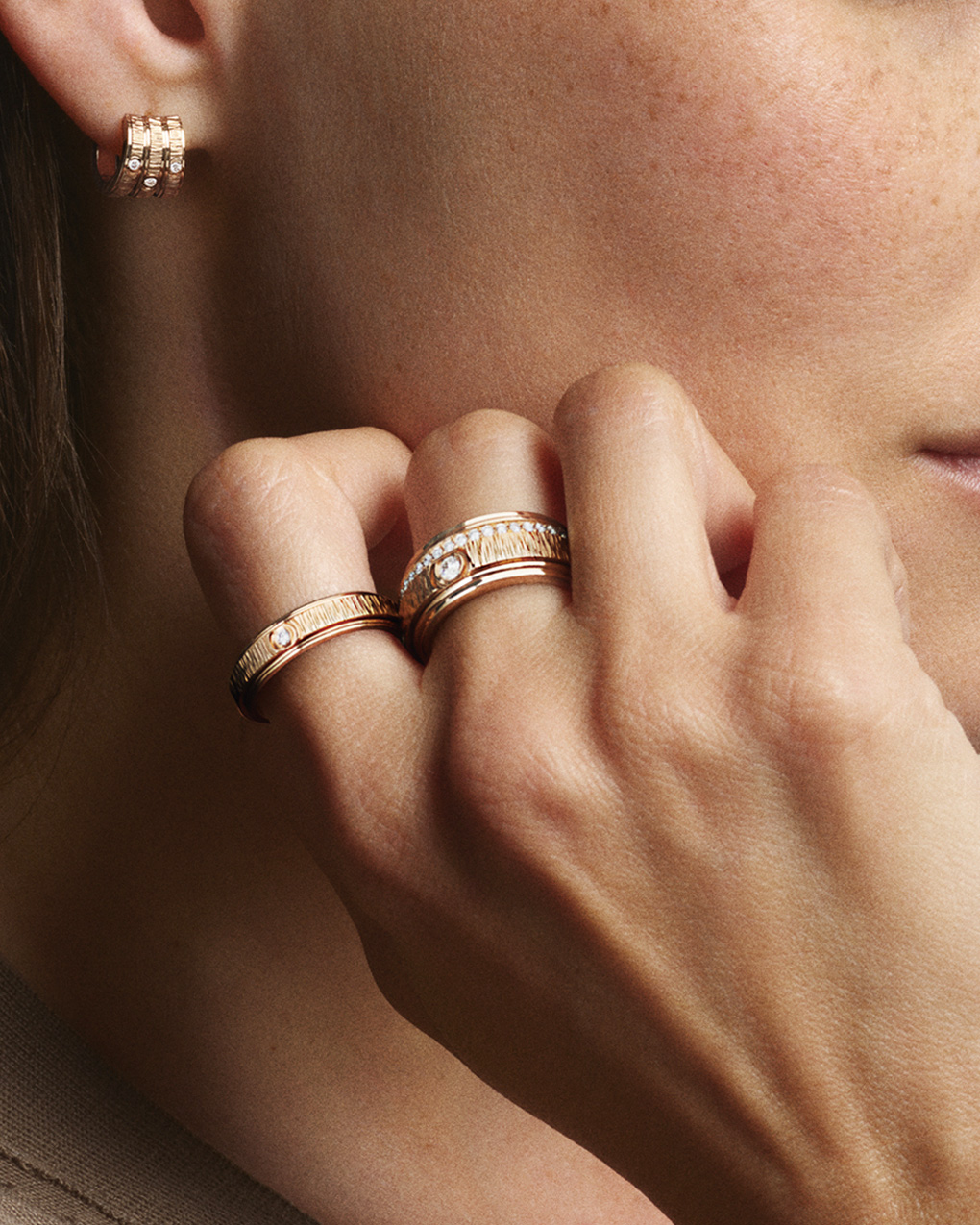 합, 볼륨감, 텍스처에 대한 피아제의 탁월한 예술적 접근법을 엿볼 수 있는 다양한 사이즈의 화이트 골드 혹은 핑크 골드 링은 하나 혹은 2개의 파베 세팅 회전 링, 포제션 세팅 다이아몬드 등 디테일을 가미해 메종의 독창성과 노하우를 전한다.