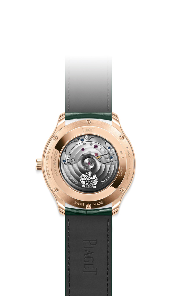 케이스 안에 쿠션 형태 페이스를 조화시켜 독특한 디자인을 보여주었다. 또한 자체 제작한 오토매틱 무브먼트를 사파이어 백케이스를 통해 확인할 수 있다. 이번에는 대담함과 생동감 넘치는 활기가 느껴지는 그린을 바로 이 폴로 컬렉션에 입혔다. 그린을 입은 피아제 폴로 데이트 다이얼 위의 그린 컬러 고드롱 패턴이 핑크 골드 케이