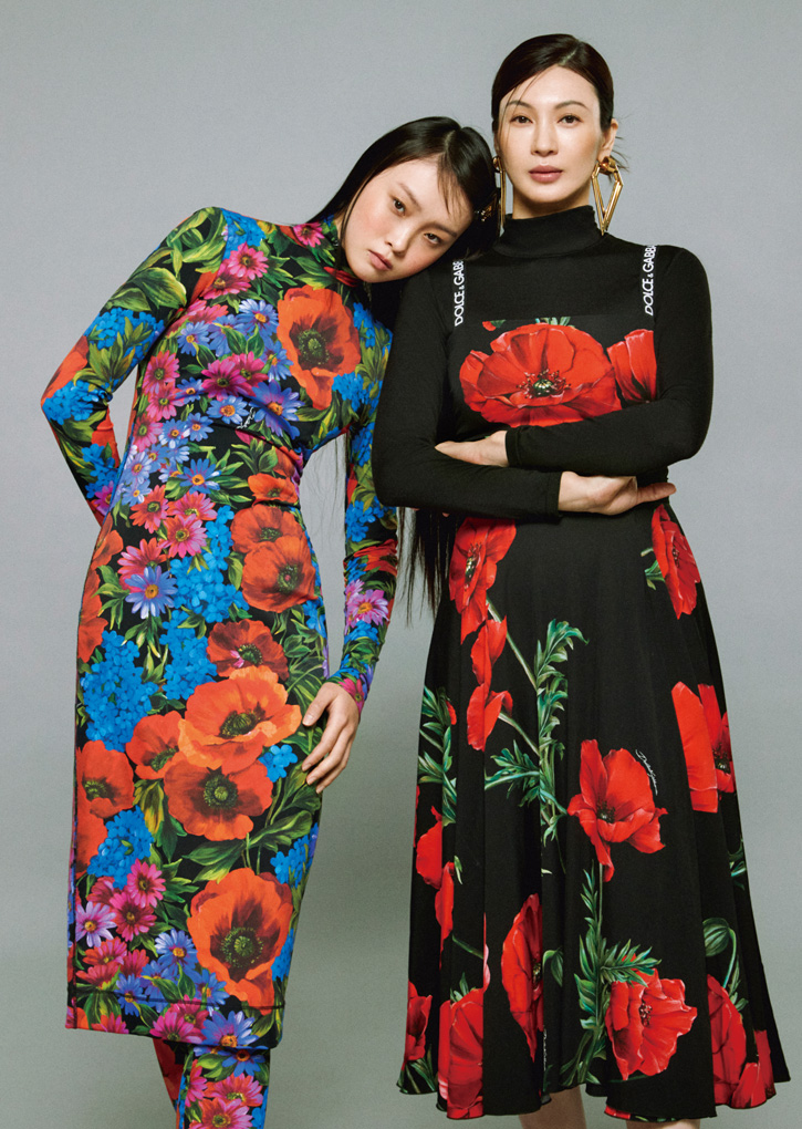 수아_ 풍성한 플라워의 세계를 담아낸 하이넥 드레스와 레깅스 모두 Dolce&Gabbana.