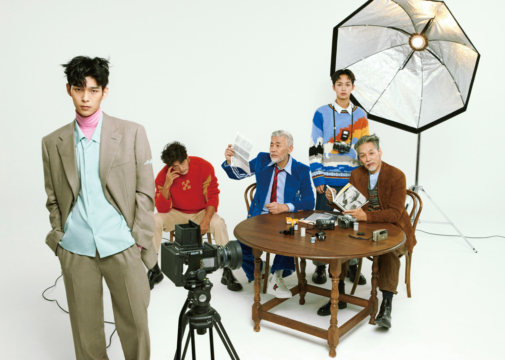 윤섭_ 코듀로이 재킷과 팬츠, 셔츠, 화이트 레더 스니커즈 모두 Gucci, 삭스와 넥타이 스타일리스트 소장품.