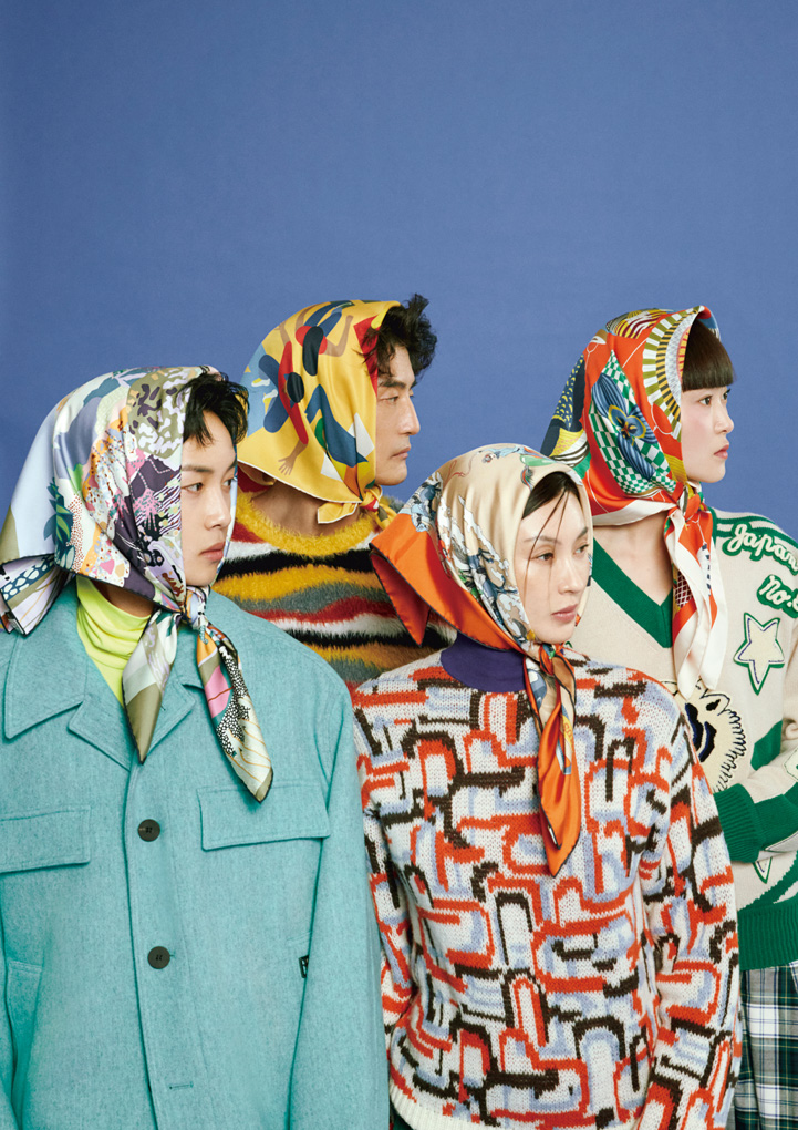수정_ 기하학 패턴 니트 Prada, 야생마를 실감 나게 표현한 더블 페이스 스카프 Hermes.