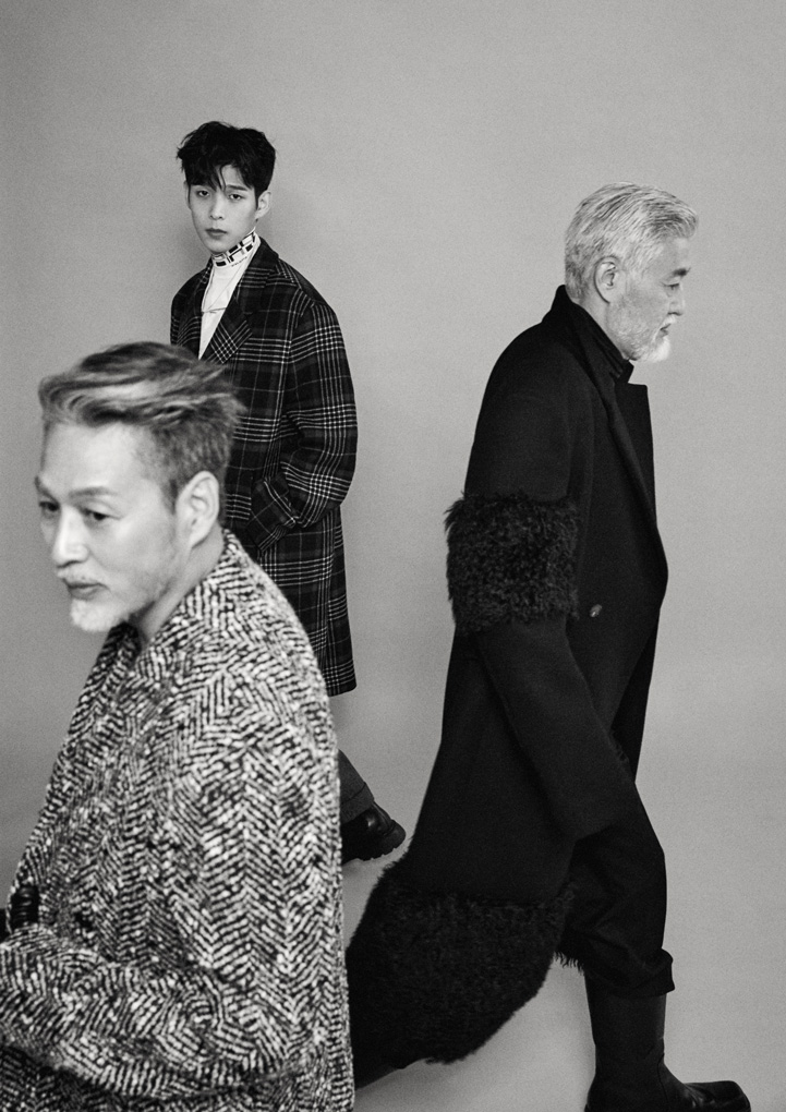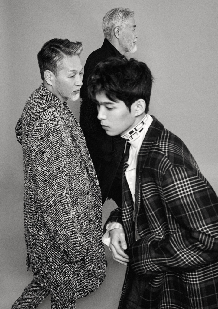 창건_ 체크 패턴 코트 Paul Smith, 오픈칼라 실크 셔츠와 패턴 포인트 터틀넥 니트 톱 Prada.