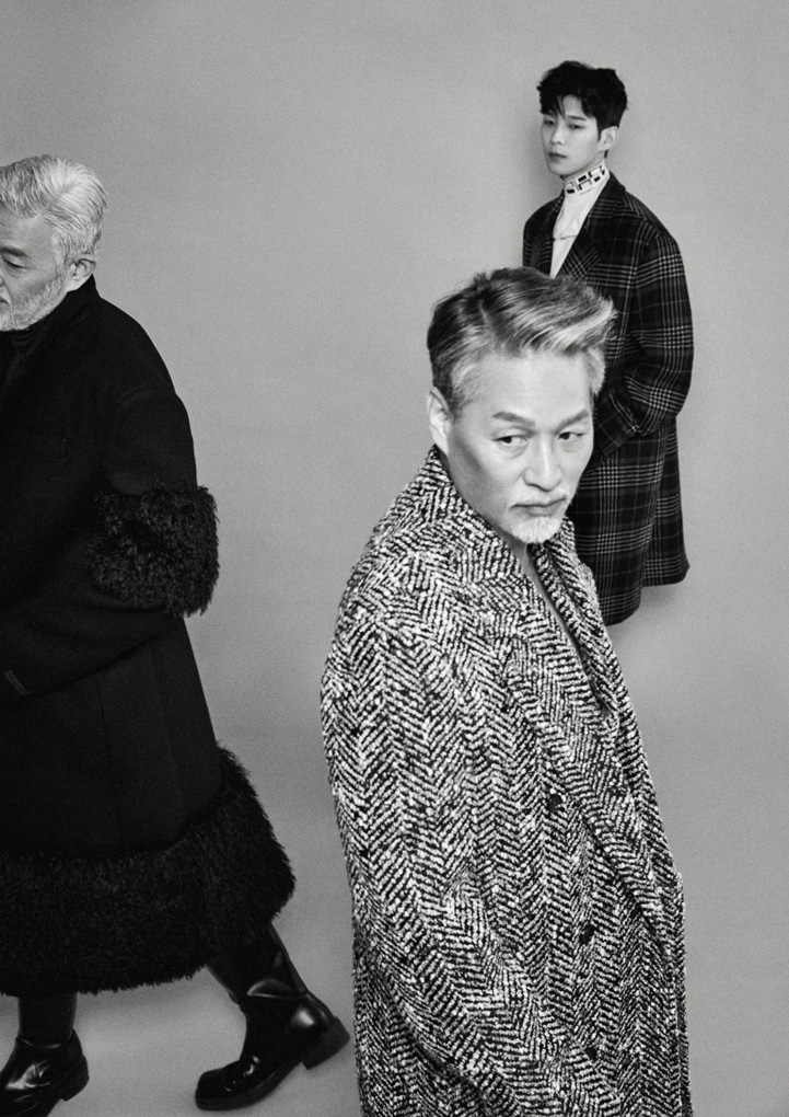 동준_ 헤링본 코트와 재킷, 팬츠, 레더 글러브 모두 Bottega Veneta.