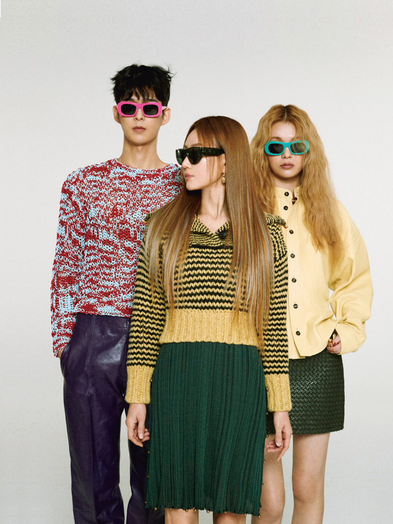 창건_ 위빙 레더 톱과 퍼플 레더 팬츠 모두 Bottega Veneta, 스퀘어 프레임 선글라스 Ferragamo.