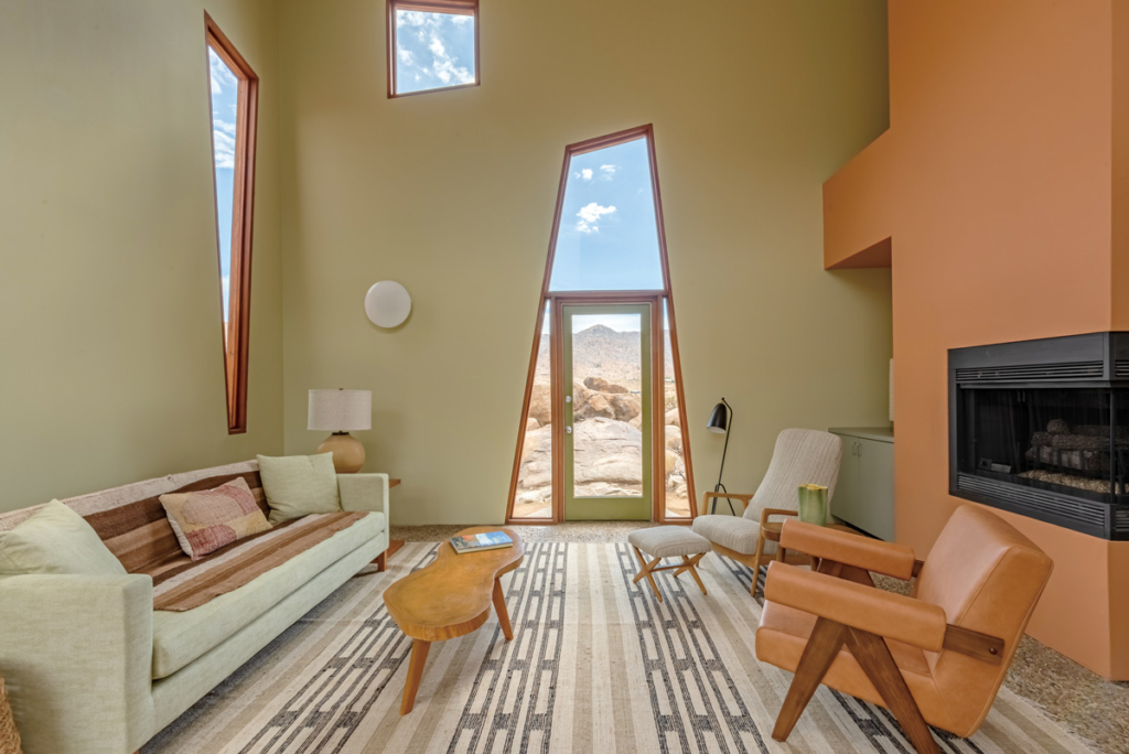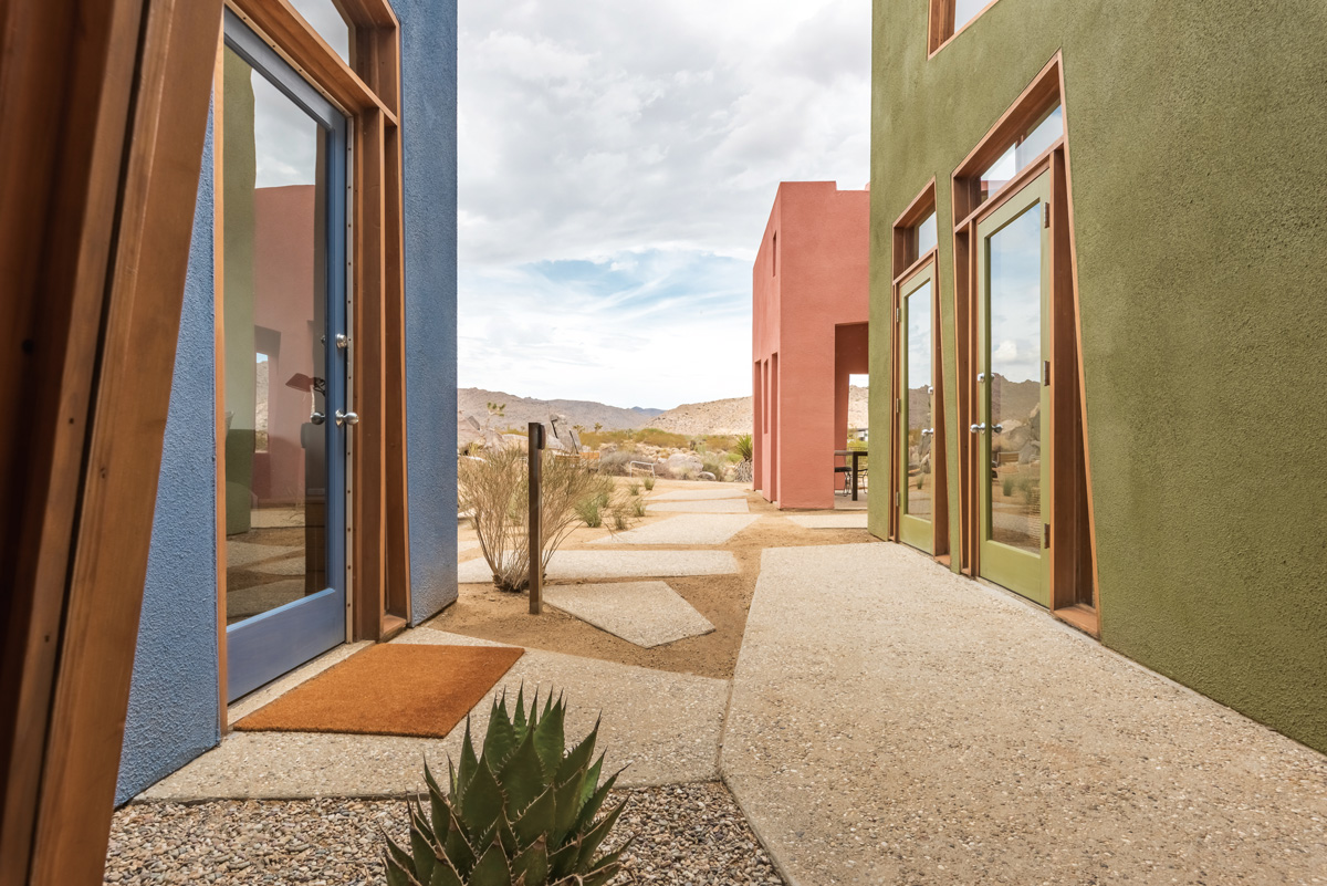 조슈아트리 지역의 기후에 기인한다. 사막 기후에서는 건물 색이 쉽게 바래는 만큼 이를 방지하기 위해 빨간색, 초록색, 파란색 등 원색을 사용한 것. 이러한 색감은 고대 신전처럼 웅장한 분위기를 자아낸다. 한편, 외벽에는 자유로운 형태의 유리문이 있다. 특히 천장 쪽에 커다란 창을 내 무더운 기후에도 충분한 바람과 자연광이 드나들며 쾌적한 환경을 만들어준다. 창문은 전혀 다른 두 가지 장면을 연출하는데, 외부에서는 날카로운 비정형으로 미니멀하면서 세련된 분위기를 풍기지만 내부에선 사막과 고원의 풍경을 담는 예술적 액자가 된다. 이는 실내 인테리어에 아늑한 느낌을 더하며 광야에서 흐르는 에너지가 자연스럽게 내부로 연결되도록 만든다.