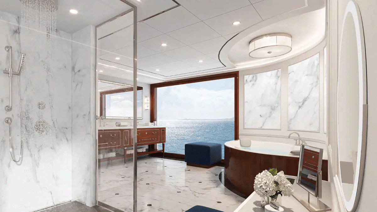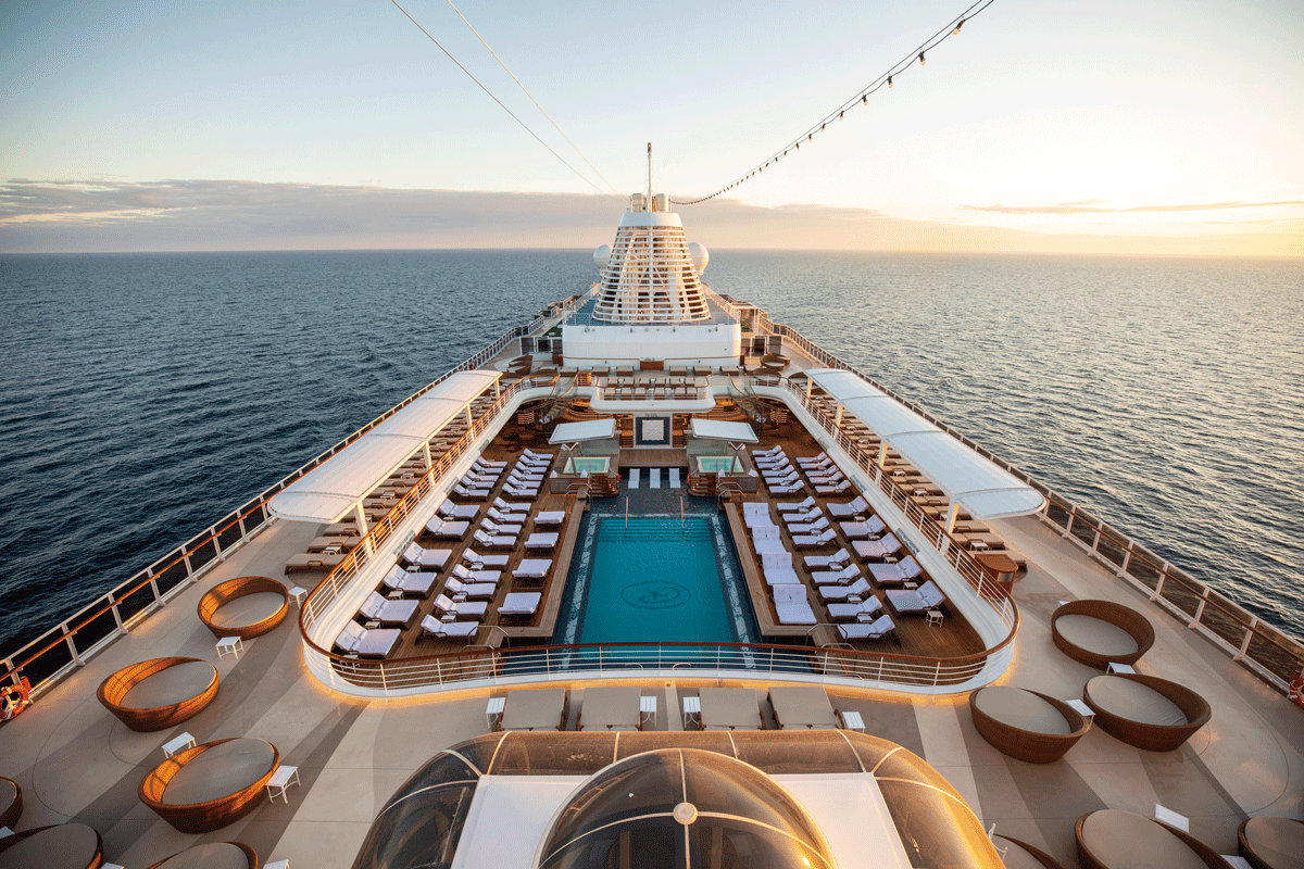 3개뿐인 오너스 스위트룸은 50평(약 165m2)을 훌쩍 넘는 크기를 자랑하는데, 의자나 식탁 등 가구는 모두 랄프 로렌 홈(Ralph Lauren Home) 제품을 비치해 클래식한 감성이 묻어난다. 내부에는 칵테일 바가 있으며, 베란다도 2개 딸려 있다. 도서관, 바 & 라운지, 카지노, 공연장 등 다양한 즐길 거리 중 특히 주목할 만한 건 풀 덱. 크루즈가 바다 위를 떠다니는 호텔이기에 자연 그대로를 반영해 설계한 공간이다. 선내가 답답하게 느껴질 즈음 풀장 속으로 뛰어들거나 선베드에서 휴식을 취하며 오롯이 자연을 감상할 수 있다.