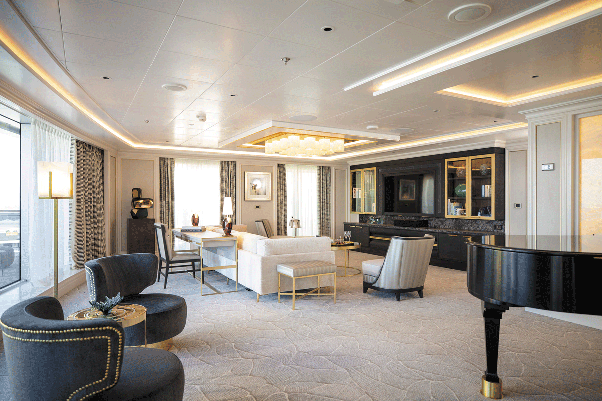 영화 <위대한 개츠비>의 한 장면을 떠올리게 하는 리젠트 세븐 시즈 크루즈 스플렌더호. 400m2가 넘는 리젠트 스위트룸은 스플렌더호 맨 꼭대기에 자리해 있다. 곳곳을 대리석과 화려한 조명, 고풍스러운 가구로 세심하게 꾸민 것이 특징. 폭신한 침대를 놓은 침실 2개, 미니 풀을 갖춘 발코니, 사우나를 구비한 스파가 있으며, 무제한으로 스파 마사지를 제공해 편안한 휴식을 보장한다. 리젠트 스위트룸에 머무르면 정박하는 항구마다 전용 가이드의 안내를 받을 수 있고, 운전기사와 함께 개인 자가용 이용이 가능하다.