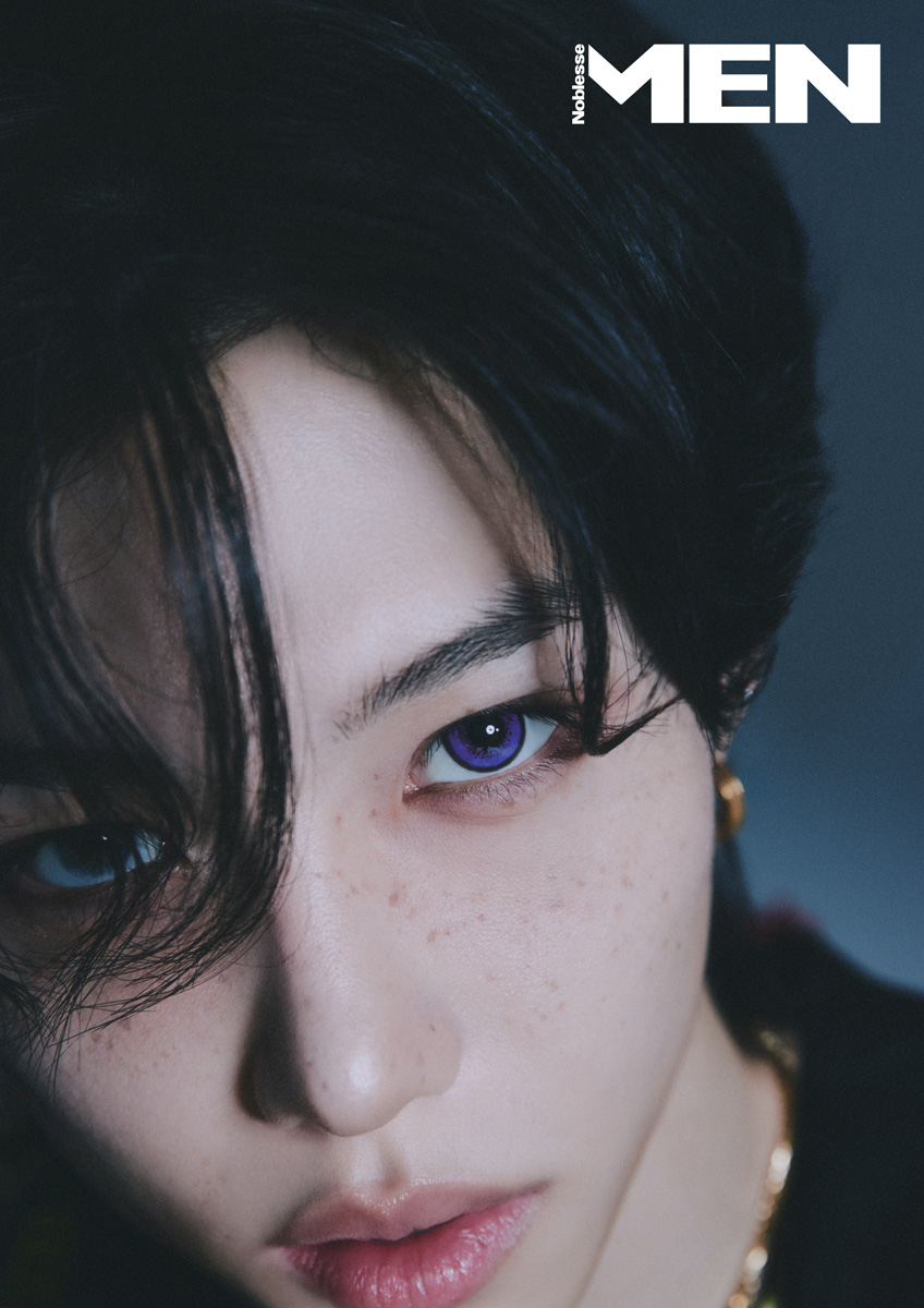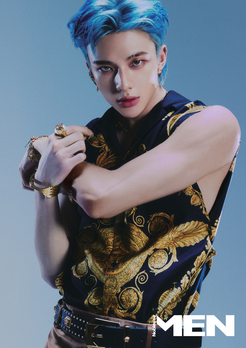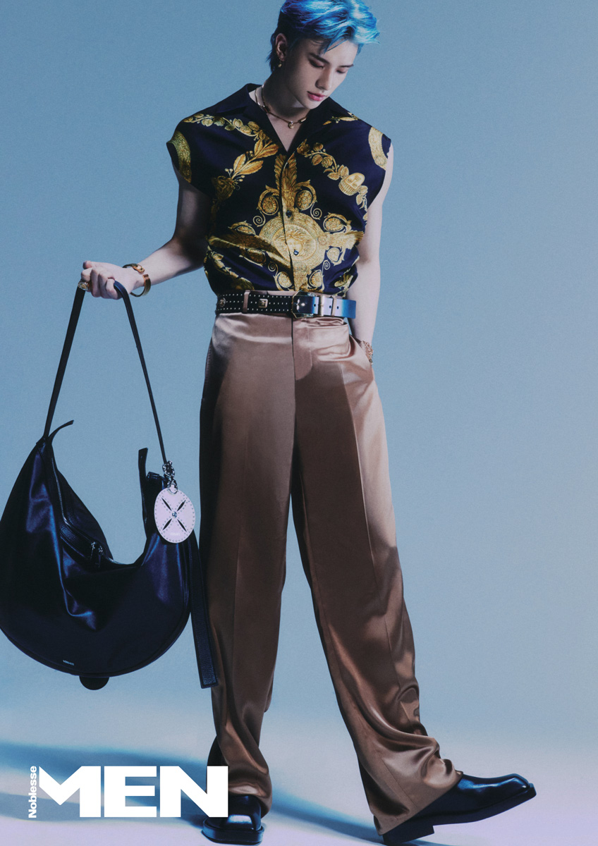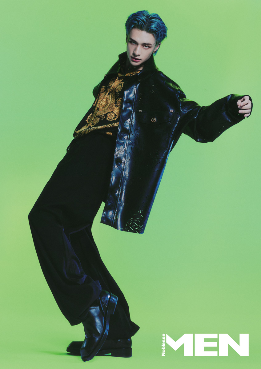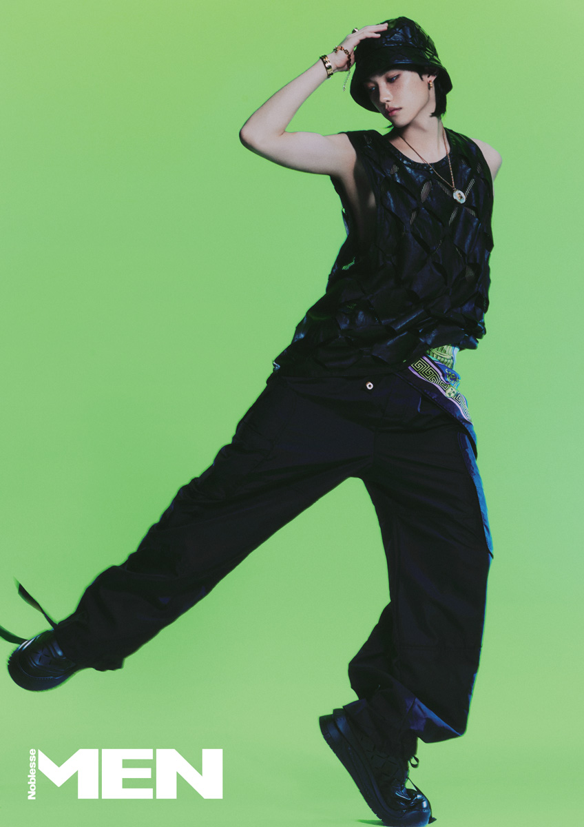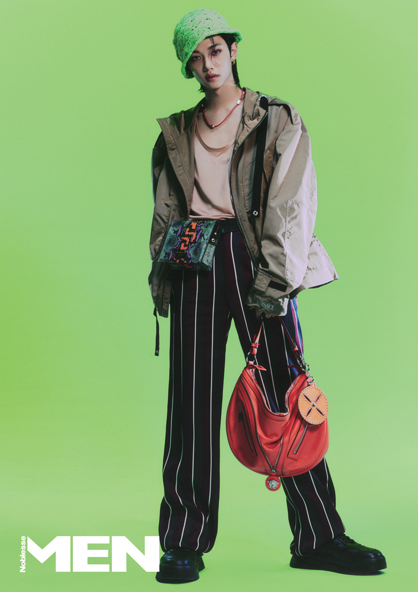 필릭스 _ 슬래시 디테일의 레더 톱과 버킷 해트, 골드 이어링, 펜던트 네크리스 모두 Versace.