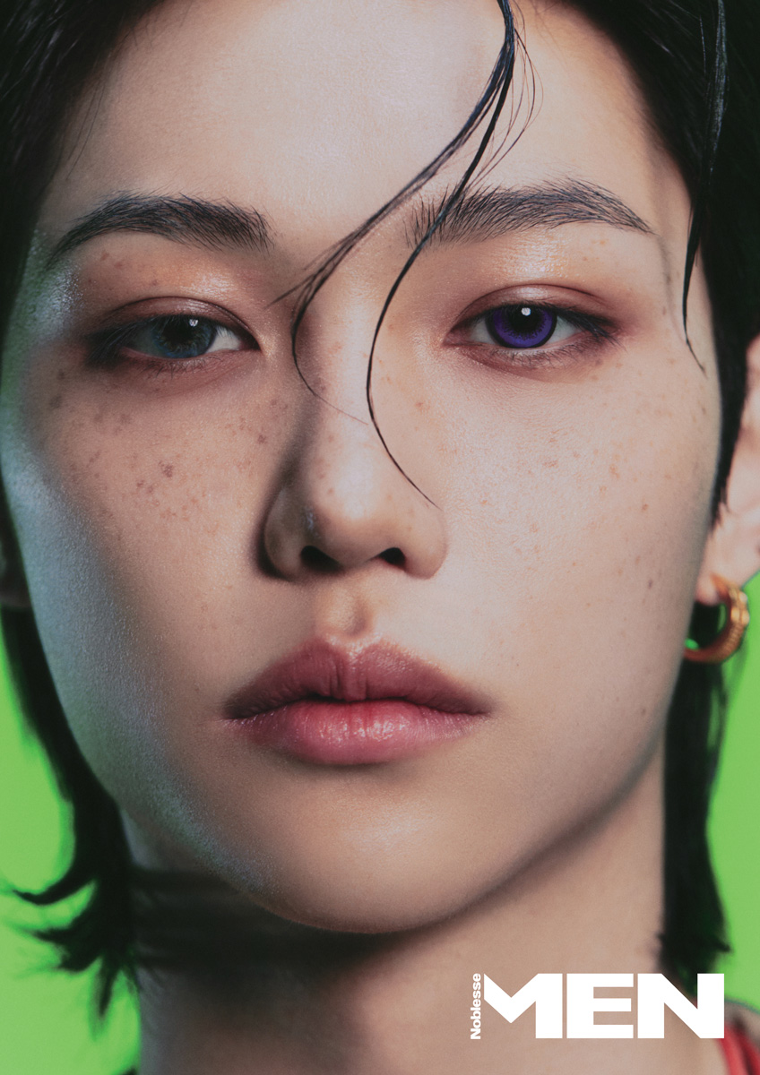 현진 _ 멀티컬러 스트라이프 패턴 슈트와 로고 장식 저지 톱, 스터드 이어링, 네크리스 모두 Versace,