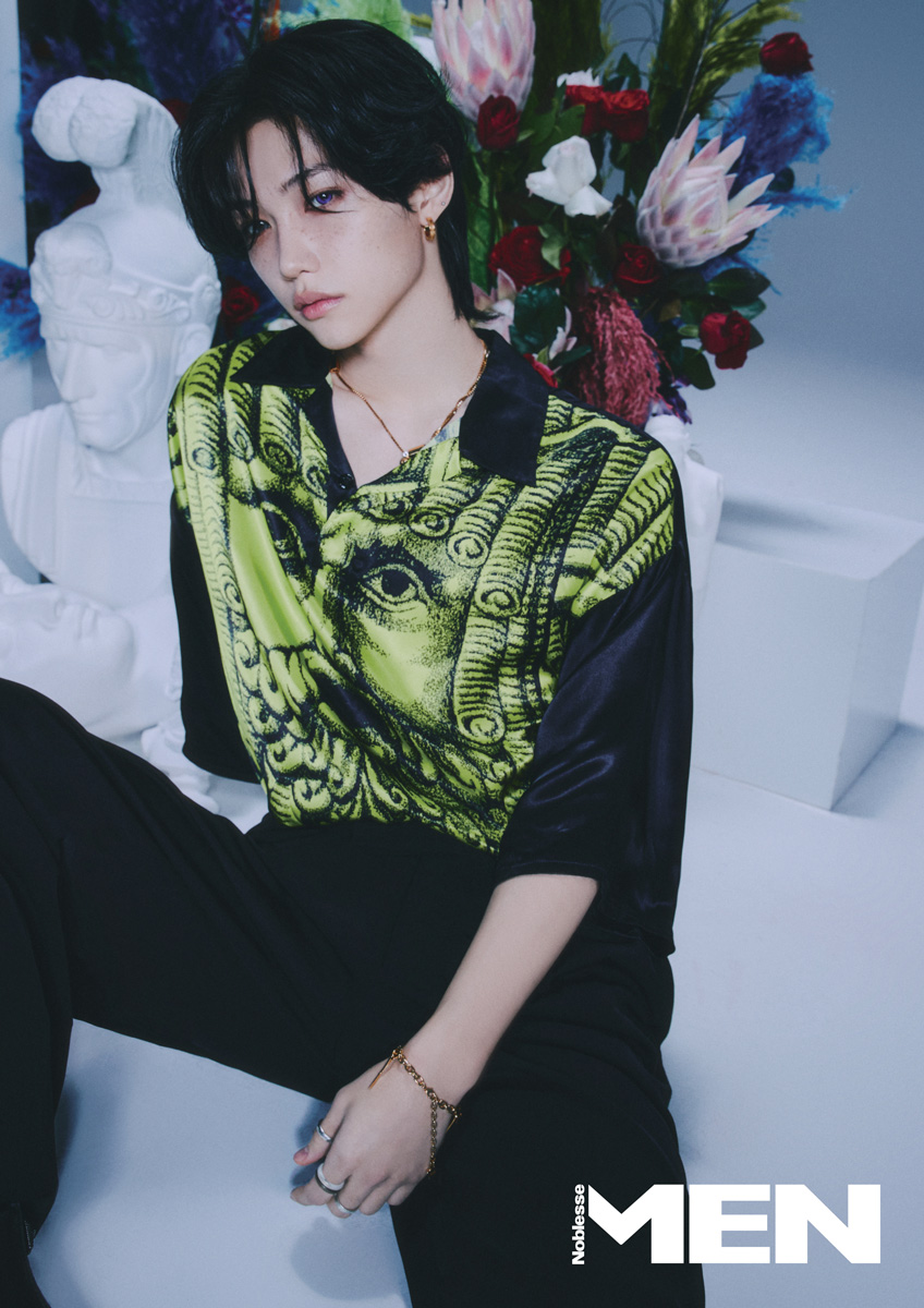 필릭스 _ 슬리브리스 실크 셔츠와 골드 이어링 모두 Versace.