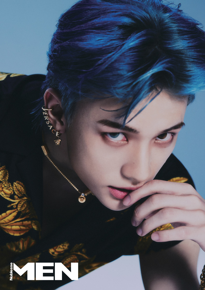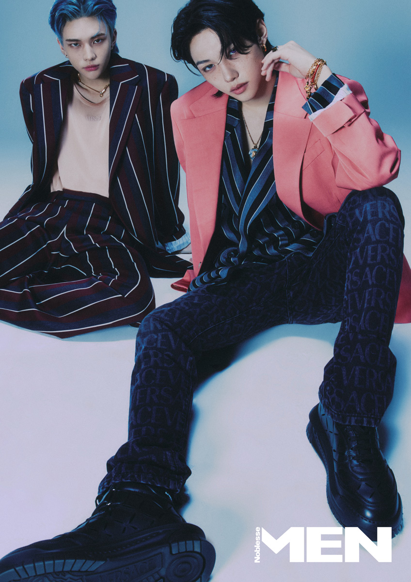 필릭스 _ 핑크 재킷과 스트라이프 패턴 재킷, 데님 팬츠, 골드 이어링, 펜던트 네크리스 모두 Versace.