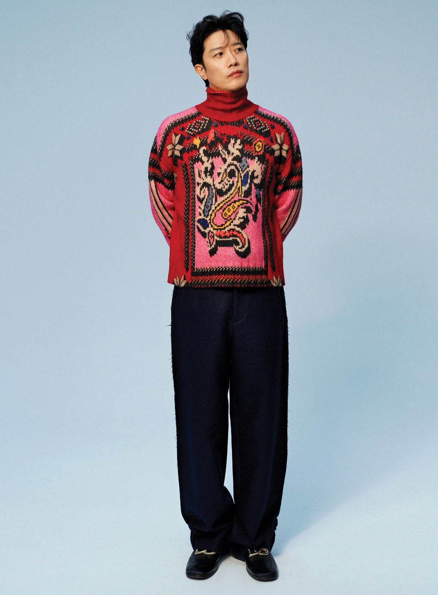 레드 니트 톱과 네이비 팬츠 모두 Etro,