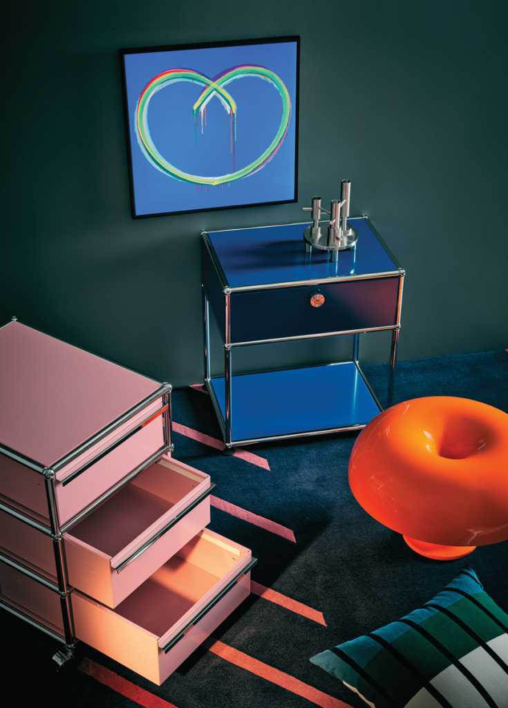 장인이 일일이 손으로 파일(pile)을 심는 방식인 핸드 터프(hand tufted) 기법으로 제작한 알마(Alma) 러그는 You and Us, USM의 모듈식 할러(Haller) 서랍장은 Space Logic, 한국 실험 미술의 거장 이건용의 첫 번째 NFT 프로젝트 작품 ‘디지털 바디스케이프 76-3’은 Etnah에서 만날 수 있다. USM의 모듈식 할러 협탁은 Space Logic, 실버 캔들홀더는 Fritz Hansen, 버섯을 닮은 아르테미데(Artemide)의 네쏘(Nesso) 램프는 a.tempo, 검은 자갈과 성벽, 푸른 바다와 숲 컬러를 표현한 크레타(Creta) 쿠션은 Kitty Bunny Pony 제품.