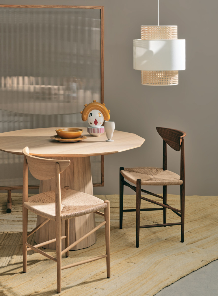 얇은 라탄을 엮어 만든 케인(Cane) 벤치는 Unwind, 광원이 보이지 않도록 설계해 자연스러운 다운라이트를 발산하는 에이콘22(Acorn22) 테이블 스탠드는 Ilkwang Lighting, 웜 노르딕(Warm Nordic)의 비 마이 게스트(Be My Guest) 캐비닛은 The Mansion, 식물을 개별적으로 꽂아 식물 자체의 선과 여백의 미를 감상할 수 있는 이케루(Ikeru) 하이 & 로 베이스는 Fritz Hansen에서 만날 수 있다. 케인 체어는 Unwind,