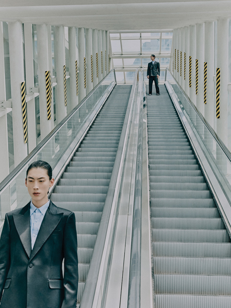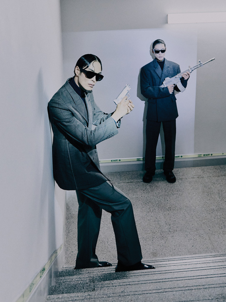 김태민 _ 오버사이즈 재킷과 팬츠, 그래픽 패턴 터틀넥 모두 Prada,