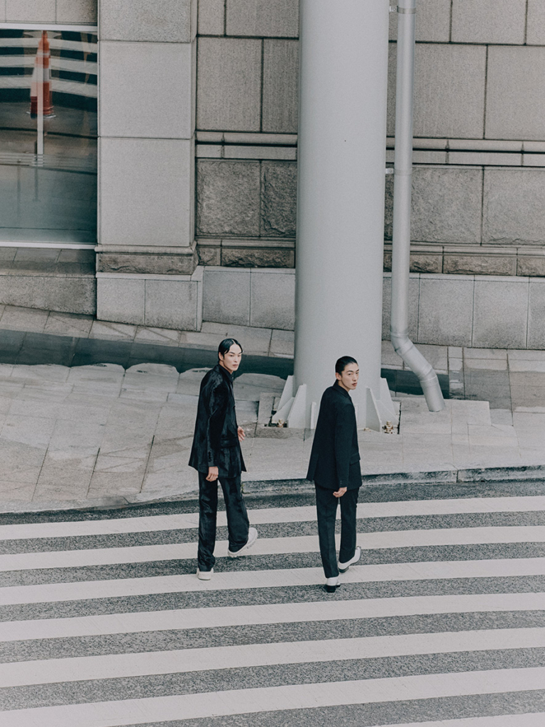 김태민 _ 교차된 라펠이 구조적인 재킷과 오버사이즈 팬츠,