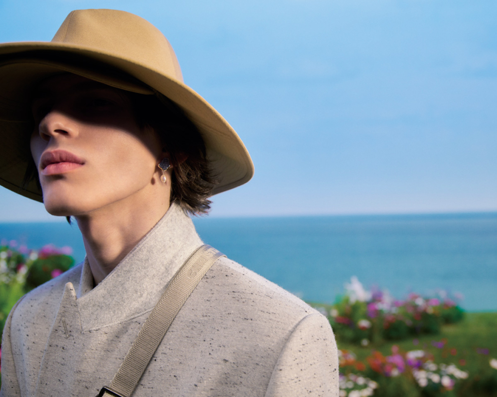 피크트라펠 오블리크 바 재킷과 와이드 브림 해트, 베이지 캡, 펄 펜던트 장식 메달리온 이어링 모두 Dior Men.