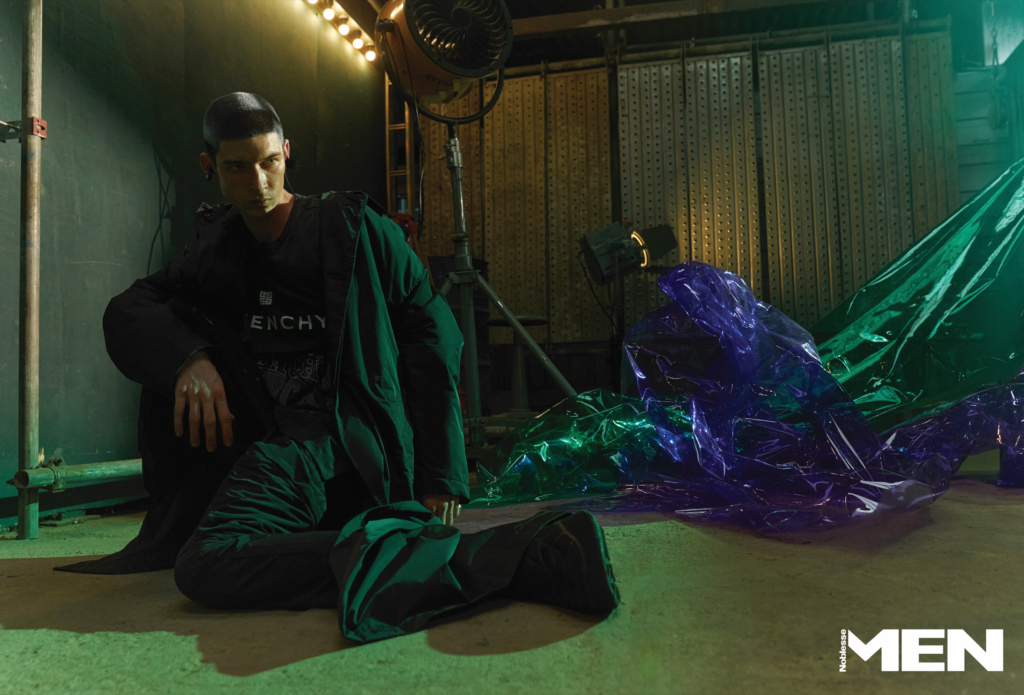 - 블랙 후디드 파카와 조거 팬츠 모두 Tom Ford.
