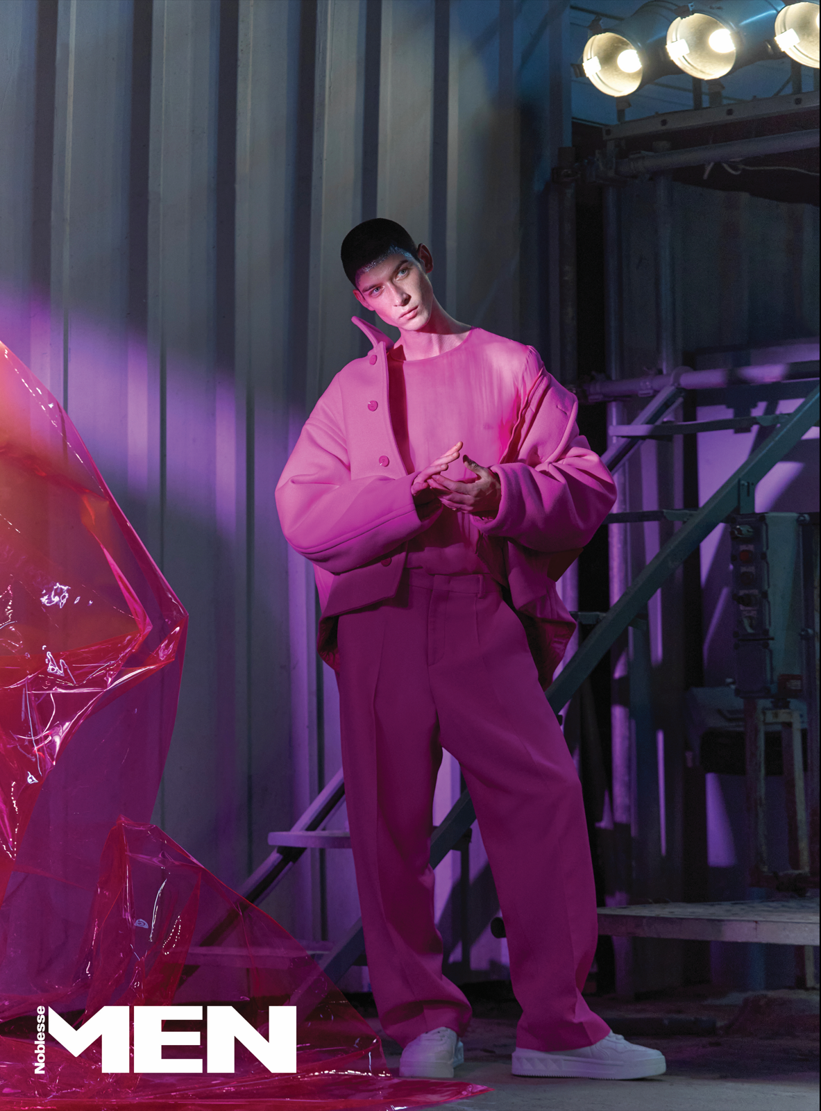 - 푸크시아 핑크 재킷과 오간자 시스루 톱, 와이드 팬츠 모두 Valentino,