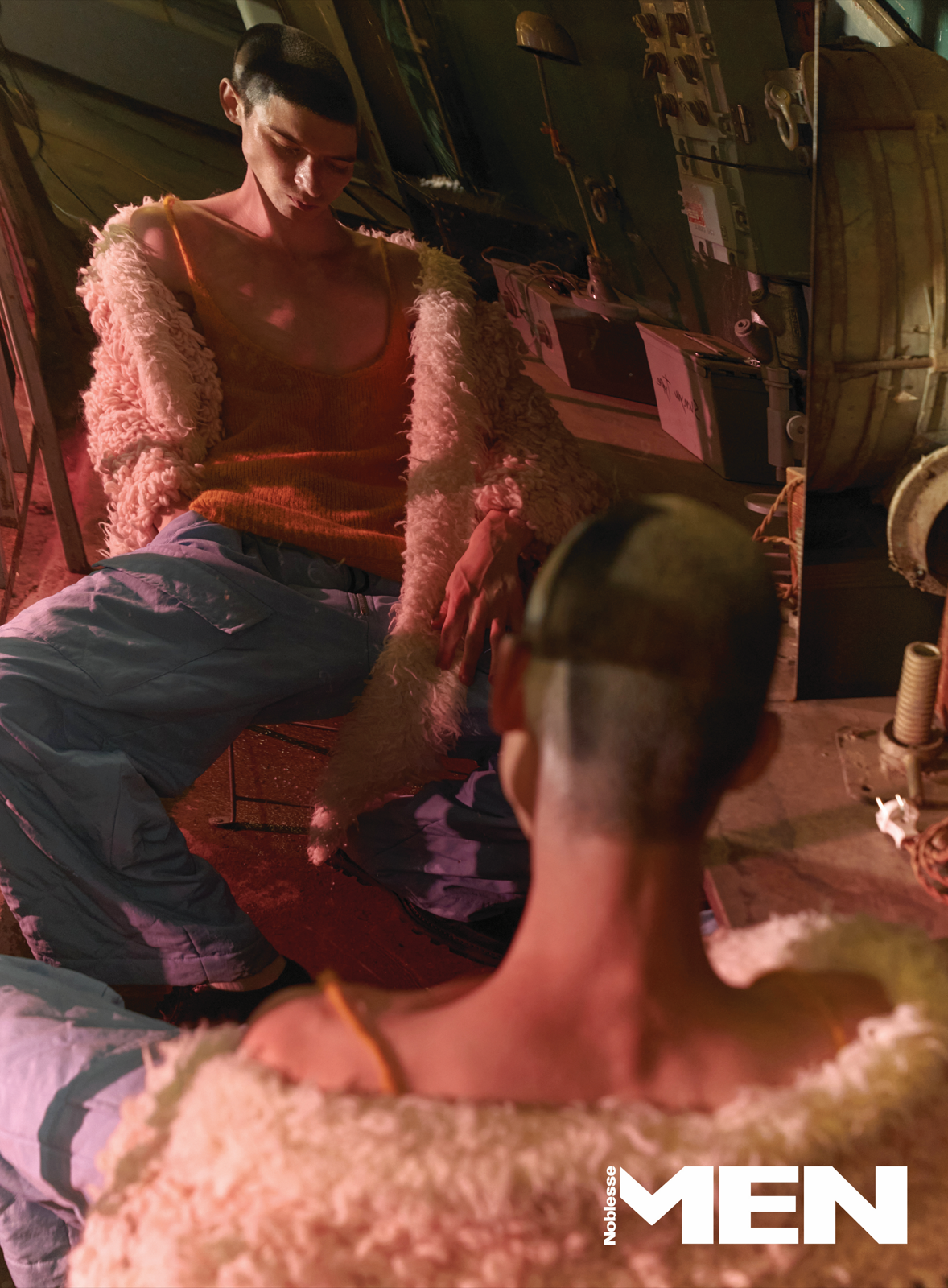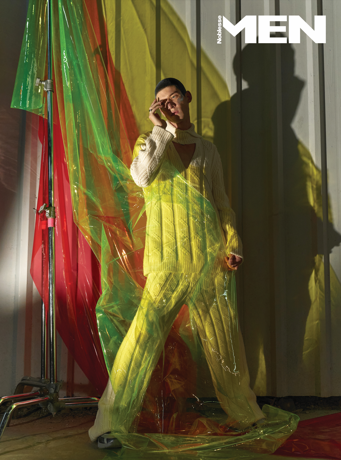 - 컷아웃 디테일의 케이블 니트 스웨터와 루스한 실루엣의 니트 팬츠, 펜디 플로우 스니커즈 모두 Fendi Men.