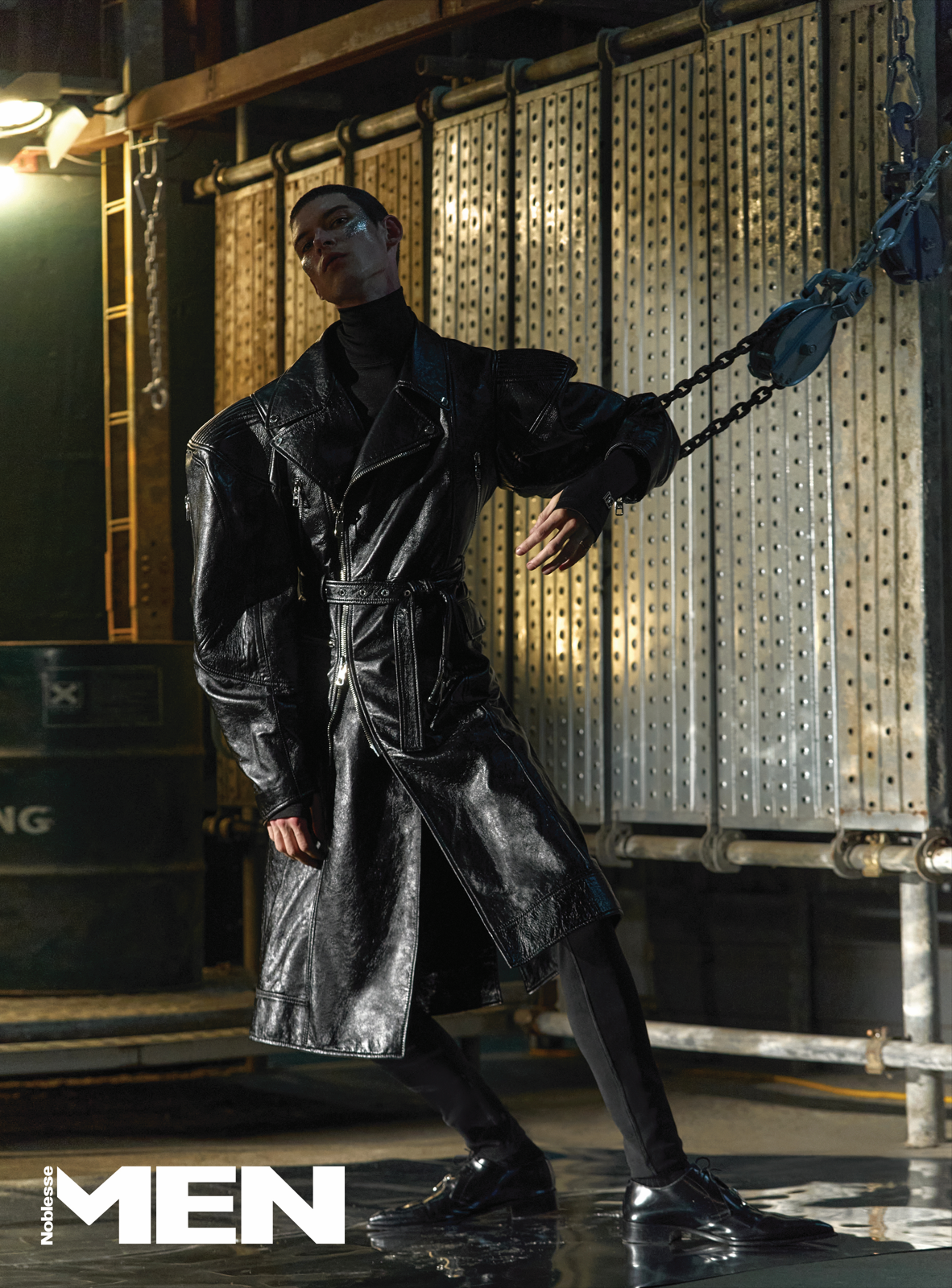 - 과장된 실루엣의 가죽 코트와 블랙 터틀넥 니트 스웨터, 레깅스 팬츠, 페이턴트 더비 슈즈 모두 Dolce&Gabbana.