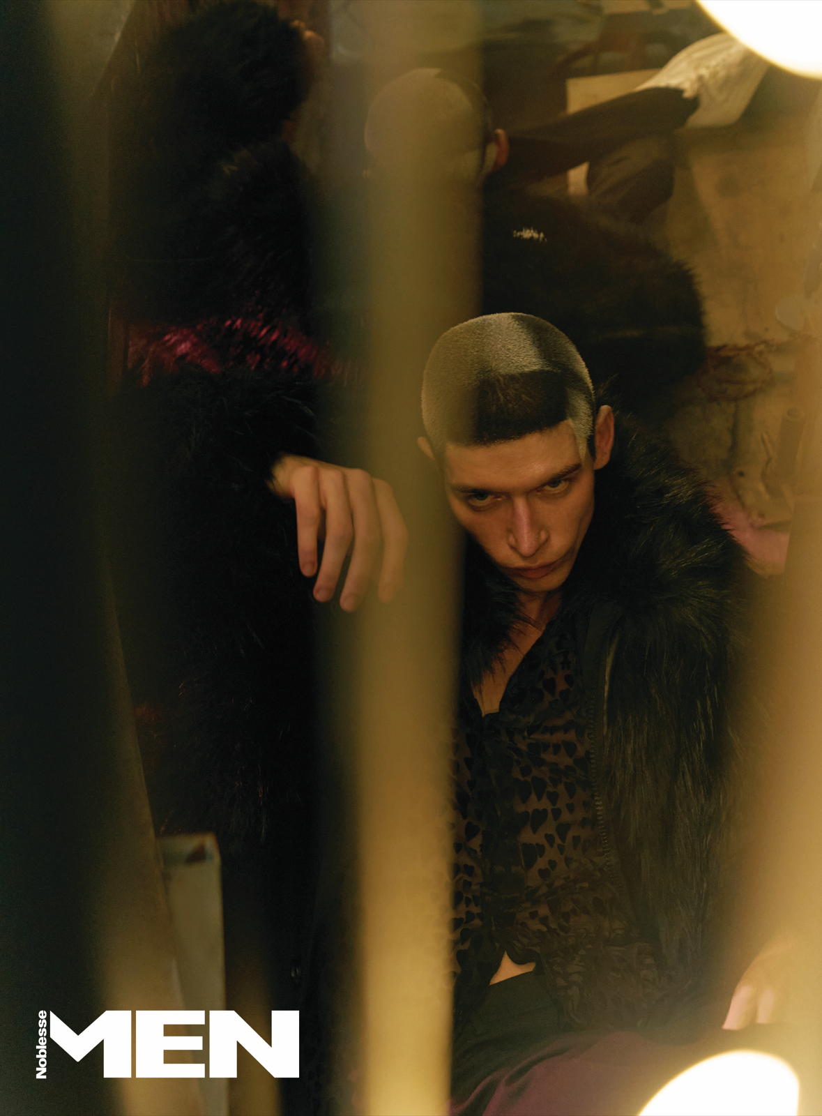 - 블랙 퍼 재킷과 시스루 셔츠, 블랙 팬츠 모두 Ami.