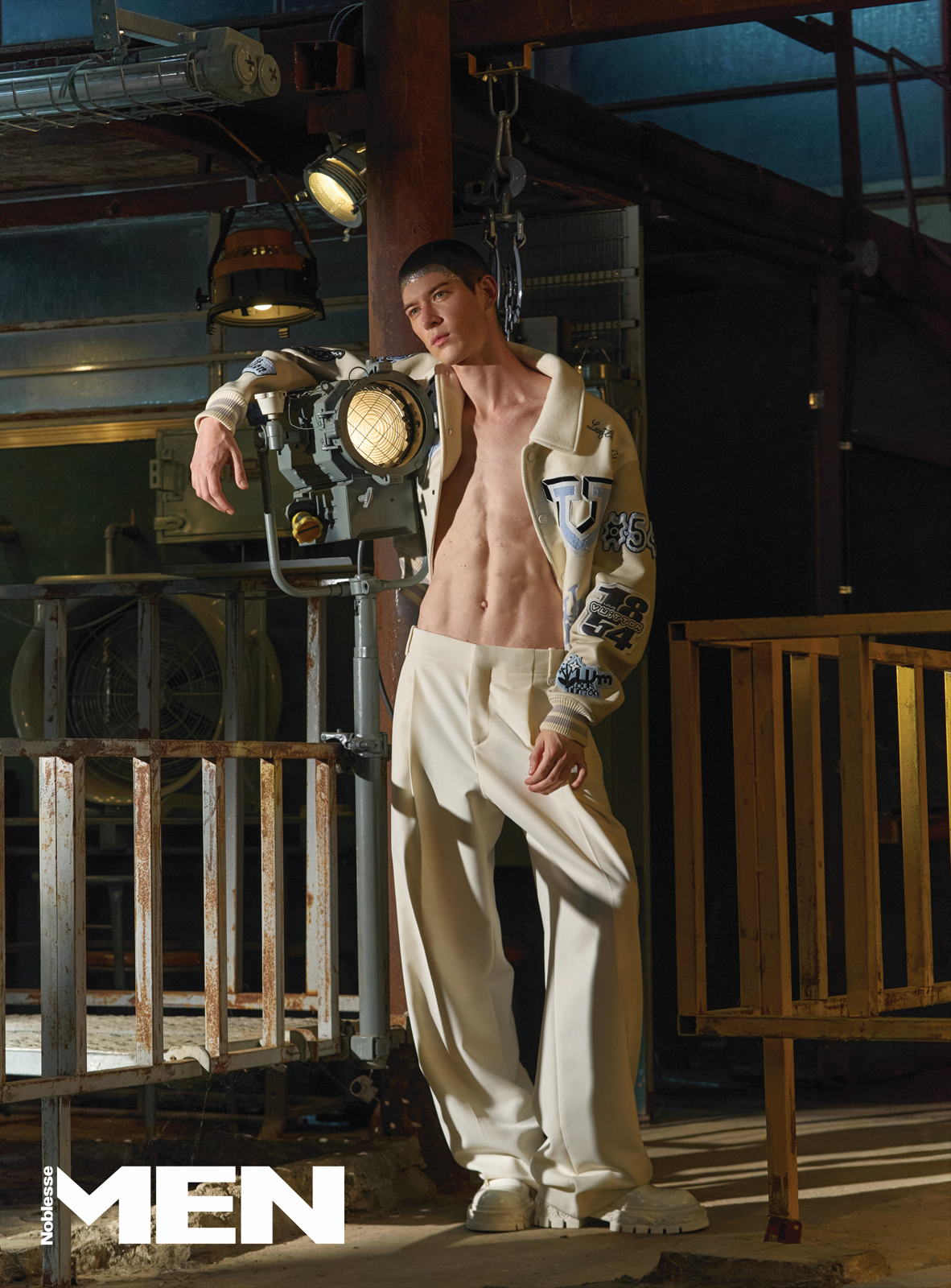 - 와펜 장식 베이스볼 재킷과 아이보리 와이드 팬츠, LV 바로크 레인저 부츠 모두 Louis Vuitton.