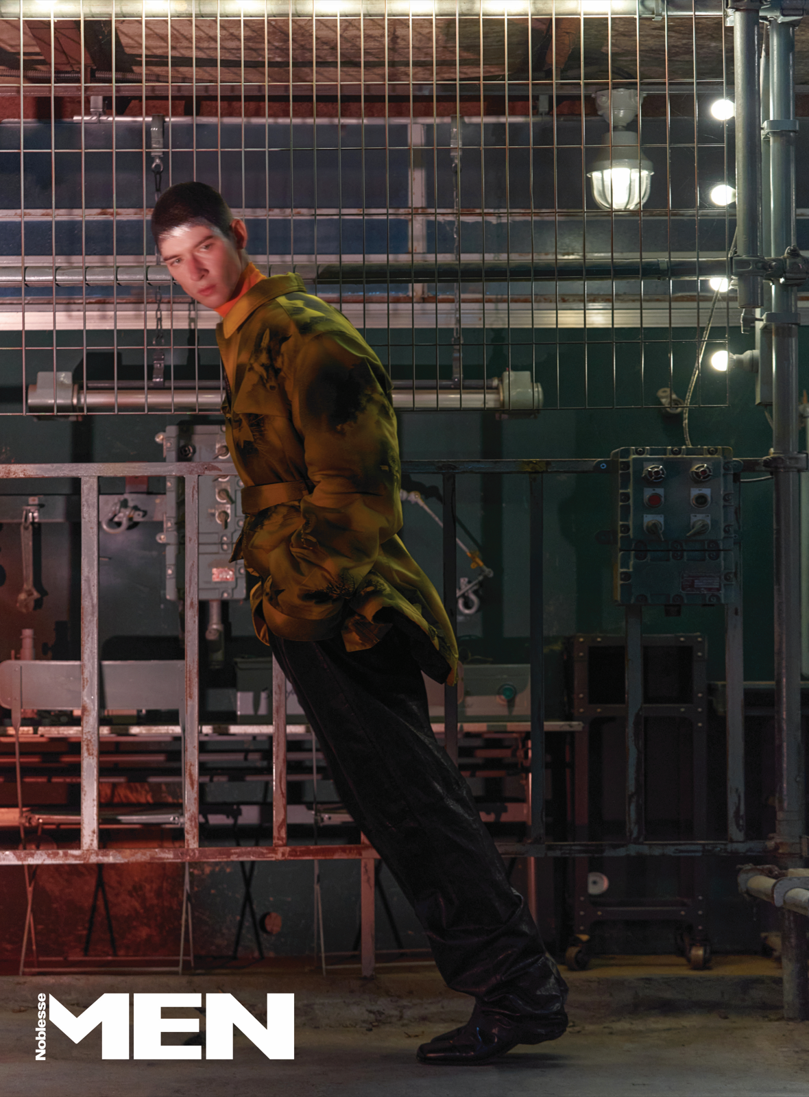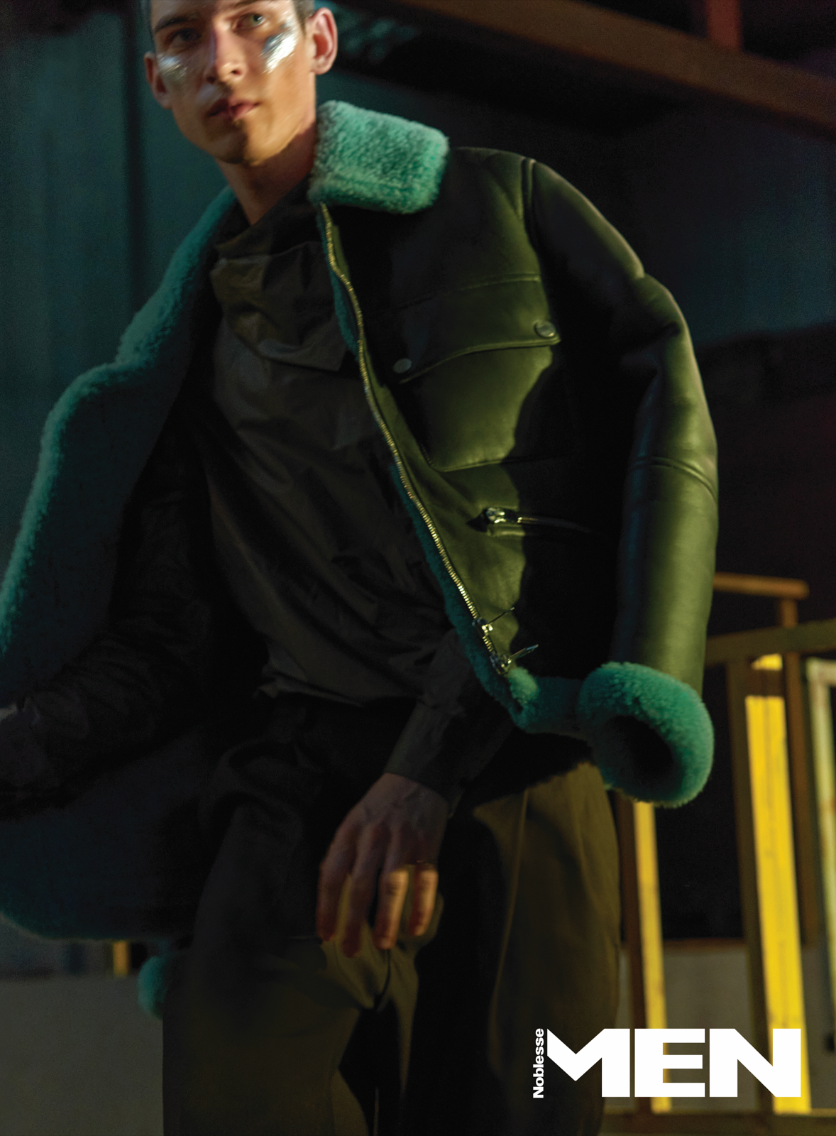 - 시어링 재킷과 포플린 셔츠, 다크 그레이 팬츠 모두 Herme`s.