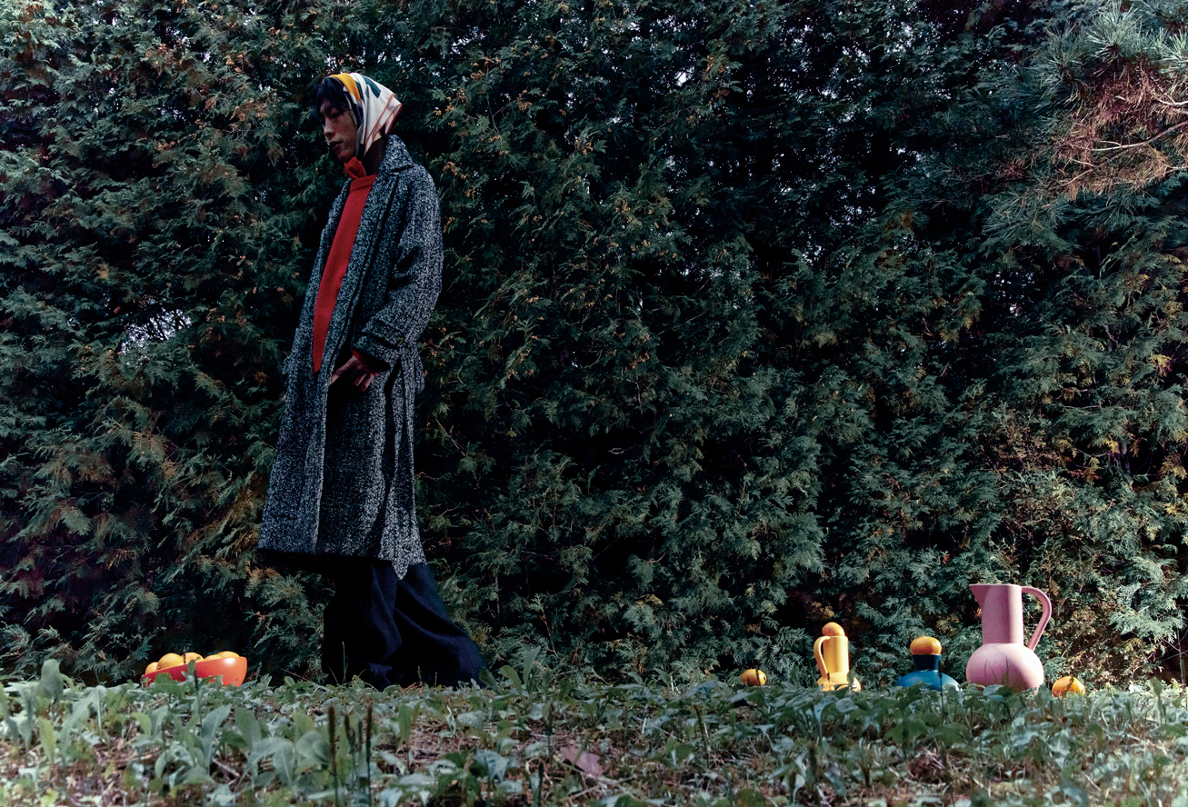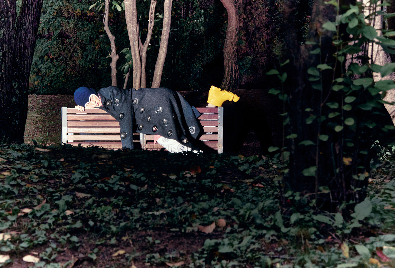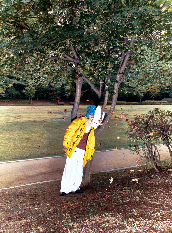 조거 팬츠, 옐로 러버 부츠, 하트 바라클라바 모두 Loewe.