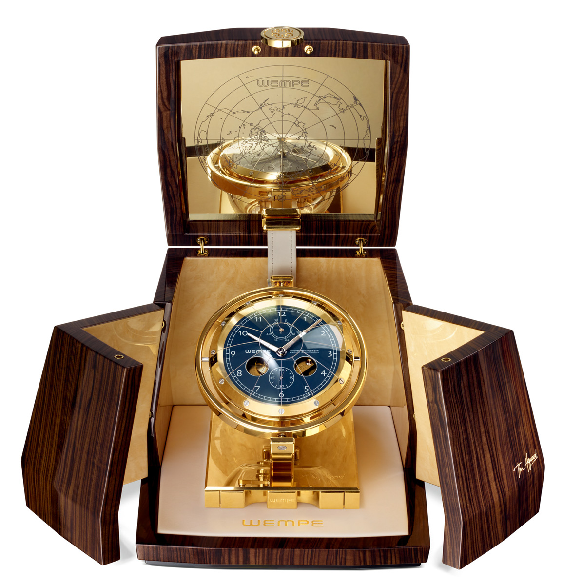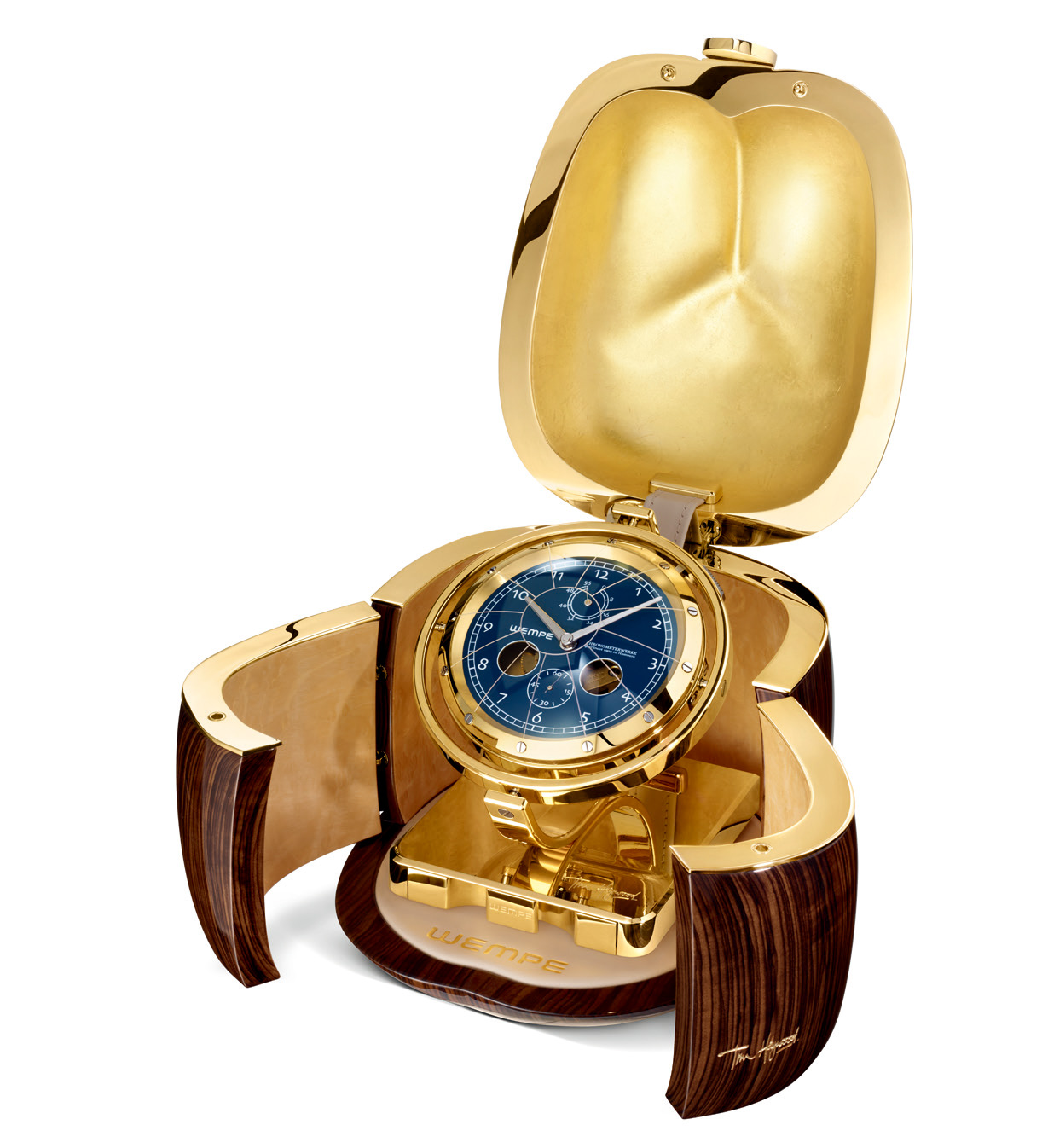 거친 바다와 끊임없이 변화하는 온도에도 흔들리지 않는 정확성을 요구하는 크로노미터가 탁상시계로 탄생했다. 1905년부터 해양 크로노미터를 만들어온 독일 시계 제조업체 벰페의 기술력과 요트 디자 이너인 팀 헤이우드가 낳은 걸작이다. 총 두 가지 디자인을 공개했는데, 그중 ‘코코 드 메르(Coco de Mer)’는 세이셸의 일부 섬에서만 발견되는 동명의 과일에서 영감을 받아 부드러운 곡선미를 강조했다. 한편 ‘큐브(Cube)’는 나뭇결을 살린 짙은 갈색 케이스 안에 황동으로 제작한 크로노미터를 탑재했다. 두 크로노미터 모두 4시와 8시 방향에 구멍이 있어 기계의 움직임을 관찰할 수 있다. 하루에 최대 속도 변동이 0.3초에 불과할 정도로 정교한 움직임을 자랑한다. 코코 드 메르는 5만7460파운드(약 9000만원), 큐브는 4만3780파운드 (약 6800만 원). 각각 50개 한정 생산.