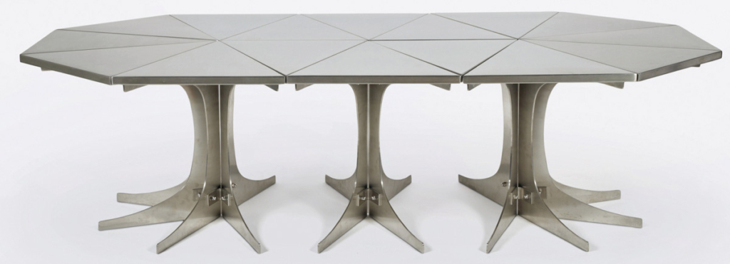 독특한 모양의 스테인리스스틸 테이블은 저명한 조각가 필립 히킬리의 작품이다. 이름은 ‘조정 가능한 식탁 (Adjustable Dining Table)’. 16개의 삼각형 상판은 이름처럼 다양한 형태로 변형이 가능해 미학은 물론 기능성을 내포한 창의적 디자인이 돋보인다. 조합에 따라 여섯 명은 거뜬히 앉을 수 있는 긴 식탁, 팔각형 탁자,작은 두 책상으로 변모한다. 1968년 히킬리가 아내를 위해 처음 제작했고, 이후 전시 기획자이자 그의 지지자였던 장 프랑수아 비도의 요청으로 같은 테이블 디자인을 하나 더 만들었다. 히킬리는 비록 가구 디자인으로 이름을 알리진 못했지만, 이 작품은 전 세계에 단 2개라는 점에서, 그중 하나는 아내를 위해 특별히 제작했다는 점에서 남다른 가치를 지닌다.