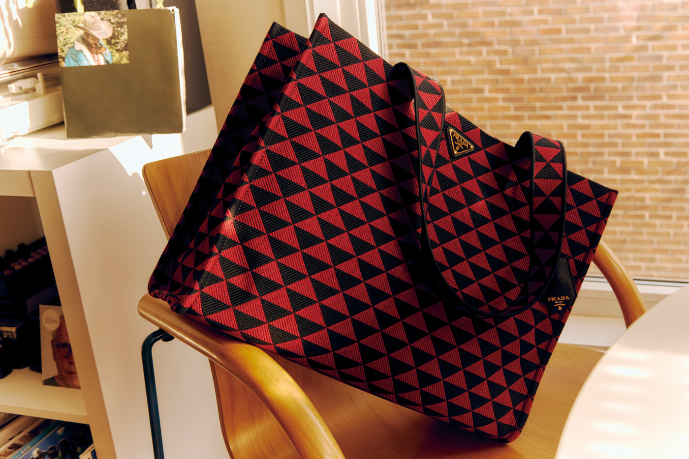왼쪽_ 트라이앵글 패턴 패브릭 쇼퍼 백 Prada.